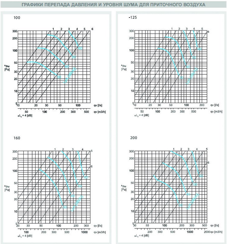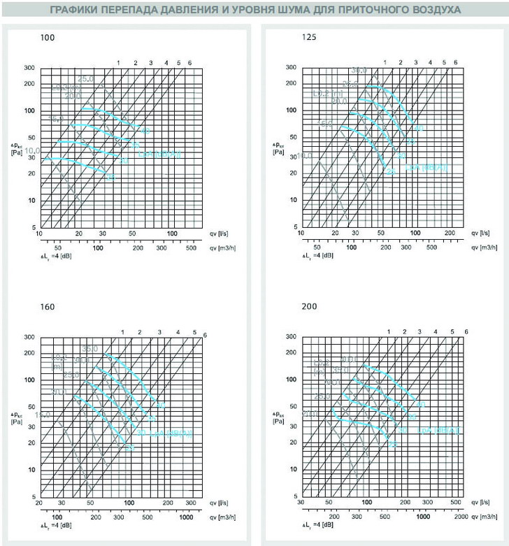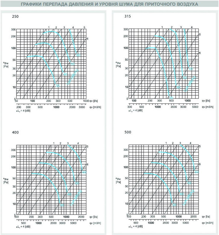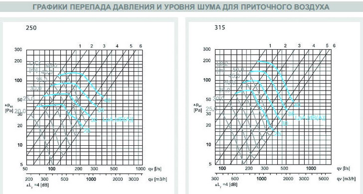 Графики перепада давления и уровня шума для приточного воздуха AIRMAX 3D