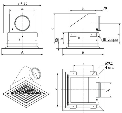 • Монтаж изделий - потолочный или настенный, как правило, в подшивном пространстве. Крепление корпуса ВБ к строительным конструкциям потолка осуществляется с помощью металлических тросов или резьбовых шпилек, пропущенных через отверстия в проушинах корпуса. К стенам ВБ крепятся за проушины корпуса с помощью кронштейнов. Герметичность соединения входного патрубка с воздуховодом обеспечивается резиновым уплотнением.