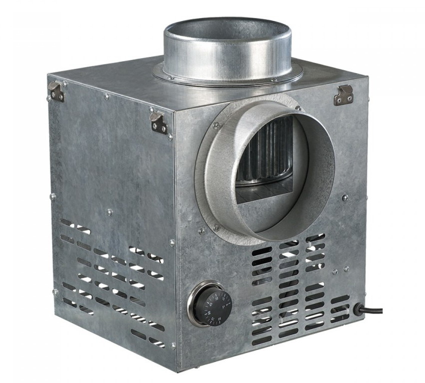 • Корпус вентилятора изготовлен из оцинкованной стали с использованием тепло- и звукоизоляционного материала из негорючей минеральной ваты. Корпус оснащен перфорацией для внутренней циркуляции воздуха и охлаждения двигателя. Вентилятор оснащен терморегулятором, с помощью которого можно задавать уровень температуры, при которой он будет включаться и выключаться. Включение вентилятора возможно в диапазоне от 0 °С до +90°С в зависимости от температуры воздуха, которая создается в теплообменном кожухе камина.
